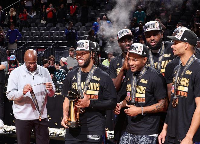 杰伦·布伦森举起第三届NBA杯MVP奖杯。决赛中他拿下25分4篮板8助攻2盖帽,正负值达到全场最高的+15。 12月17日,这位2018年二轮秀带领尼克斯队在NBA杯决赛中以124-113战胜马刺队。马刺队拥有众多才华横溢、前途光明的年轻球星,可以与雷霆队相媲美。但现在的马刺队太不成熟,输给了更有经验的尼克斯队。文班亚马在这场比赛中再次展现了自己的天赋,他的空中接力背扣技术让所有人大吃一惊。然而关键的最后一节,文班的进攻选择有些急躁,没有办法解决问题。文班最后一节只得到2分。杰伦·布伦森现在是一个更好的领导者。本场比赛,他被严密防守,进攻效率确实不高,但他还是打出了攻防结合的表现,帮助尼克斯队在场上取得了成功。布伦森上场 41 分钟tes,正负值为+15。在此期间,尼克斯队净胜马刺队15分。布伦森不在场的7分钟内,尼克斯队输给了马刺队4分。 NBA杯淘汰赛阶段,布伦森场均贡献33.3分和6.7次助攻,投篮命中率高达55%。 2018年的二轮秀再次证明了他的拼搏能力。有些NBA球员在常规赛期间状态火热,但到了高端比赛,或者到了季后赛、附加赛、NBA杯淘汰赛时,状态就下降了。布伦森是那种拼劲十足、打得更好的球员。布伦森季后赛场均贡献25.4分和5.4次助攻,好于他常规赛生涯场均18.6分和5.1次助攻。布伦森上赛季常规赛场均贡献26.0分、2.9个篮板和7.3次助攻。季后赛中,布伦森上赛季场均贡献29.4分、3.4个篮板和7.0次助攻。他带领尼克斯队闯入东部ern 分区决赛。遗憾的是,东部决赛尼克斯队以2-4不敌步行者队。 2025年夏天,尼克斯解雇了锡伯杜,聘请迈克·布朗担任主教练。布伦森在锡伯杜手下摇身一变成为全明星球员。迈克·布朗执教尼克斯队,布伦森也有火热的表现。客观来说,现在的尼克斯阵容基本是上赛季打磨出来的,是攻防兼备的阵容。迈克·布朗的运气比锡伯杜好。尼克斯队本赛季非常健康,球队状态强劲。输给马刺队后,尼克斯队在全部八场比赛中都取得了不错的表现。阿奴诺比贡献28分9篮板3助攻。唐斯得到16分和11个篮板。哈特得到11分、8个篮板和3次助攻。布里奇斯得到11分、5个篮板和5次助攻。米切尔罗宾逊得到4分、15个篮板、2次助攻和2次盖帽。克拉克森拿下15分。科莱克14分5篮板5助攻。毫无疑问,尼克斯仍然是东部最强的球队之一。布伦森成为历史上第三位NBA杯MVP,前两位是字母哥和詹姆斯。