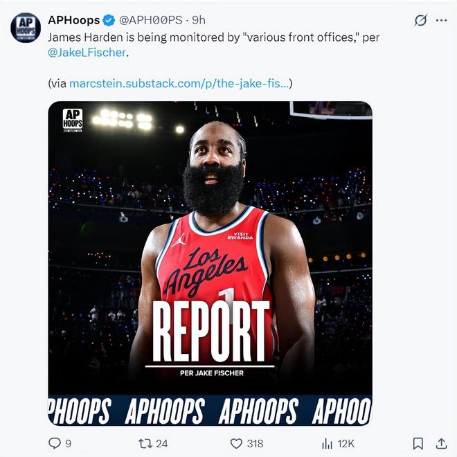 北京时间12月24日,据《Bleacher Report》记者杰克·费舍尔报道,多支球队的管理层正在关注詹姆斯·哈登的动向。甚至有传言称快船至少收到了一份首轮选秀权报价,但快船至今尚未将哈登摆上货架。快船队本赛季的表现一直低于预期。快船媒体APHoops一直想帮助36岁的邓实现自己长久以来的梦想,赢得总冠军,所以12月19日,他晒出了一张哈登+杜兰特身穿火箭队球衣的照片,并写道:Hi Houston。哈登职业生涯曾两次与杜兰特联手。第一次是在俄克拉荷马雷霆队,第二次是在布鲁克林篮网队。虽然杜兰特和哈登两次没能夺冠,但是两人建立的这份深厚的友谊以及哈登的组织能力确实可以为杜兰特分担不少压力。哈登本赛季场均出战35.6分钟赛季场均25.8分5.2篮板8.2助攻1.3抢断0.4盖帽,投篮命中率43.3%,三分球命中率37.3%。哈登的助攻排名联盟第五,得分排名联盟第13。船媒APHoops还模拟了快船和火箭的交易方案:火箭得到:哈登、祖巴茨、2027年首轮互换权(雷霆)、灰熊2026年次轮选秀权;雷霆获得:伊森、范弗利特、亚当斯、芬尼-施史密斯、太阳2027年首轮互换权、2029年首轮选秀权(火箭、太阳、小牛中最高的选秀权);这笔交易保留了谢泼德,并解雇了伊森、亚当斯和芬尼-史密斯。他相信这笔交易对于两支球队来说都是双赢的。大鹏的首发阵容可以换成哈登、阿门、杜兰特、沉静、祖巴茨。这样一来,沉静的进攻、组织、防守压力都会大大减轻。祖巴茨也可以作为詹姆斯的替补,继续在第四位置首发。在。祖巴茨比海王年轻,可以陪伴沉静更长时间。